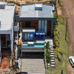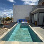 Área externa com piscina borda infinita com prainha e hidromassagem