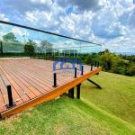 Piscina com deck de madeira suspenso